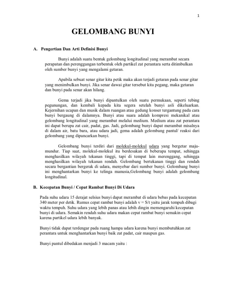 Dua sekon kemudian terdengar bunyi pantul dari dasar laut. Secara matematis, cepat rambat bunyi dapat dituliskan : S = jarak (m) v = cepat rambat gelombang. Jadi, cepat rambat bunyi dalam air laut adalah 1500 m/detik. Cepat rambat bunyi dipengaruhi oleh kondisi udara, terutama suhu dan tekanan udara. Cepat rambat bunyi dalam gas; Karena bunyi sebagai gelombang, maka cepat rambat bunyi dapat dituliskan : Cepat rambat bunyi di udara dapat ditentukan dengan menggunakan rumus: Mengukur cepat rambat gelombang bunyi dapat dilakukan dengan metode resonansi pada tabung resonator (kolom udara). Hubungan cepat rambat bunyi dengan suhu. Ani berteriak didepan dinding pantul dan dapat mendengarkan suaranya lagi. Bunyi pantul yang terdengar jelas setelah. Bunyi pantul yang diterima telah menempuh dua kali perjalanan, yaitu dari sumber bunyi ke pemantul dan dari pemantul ke penerima atau pendengar.