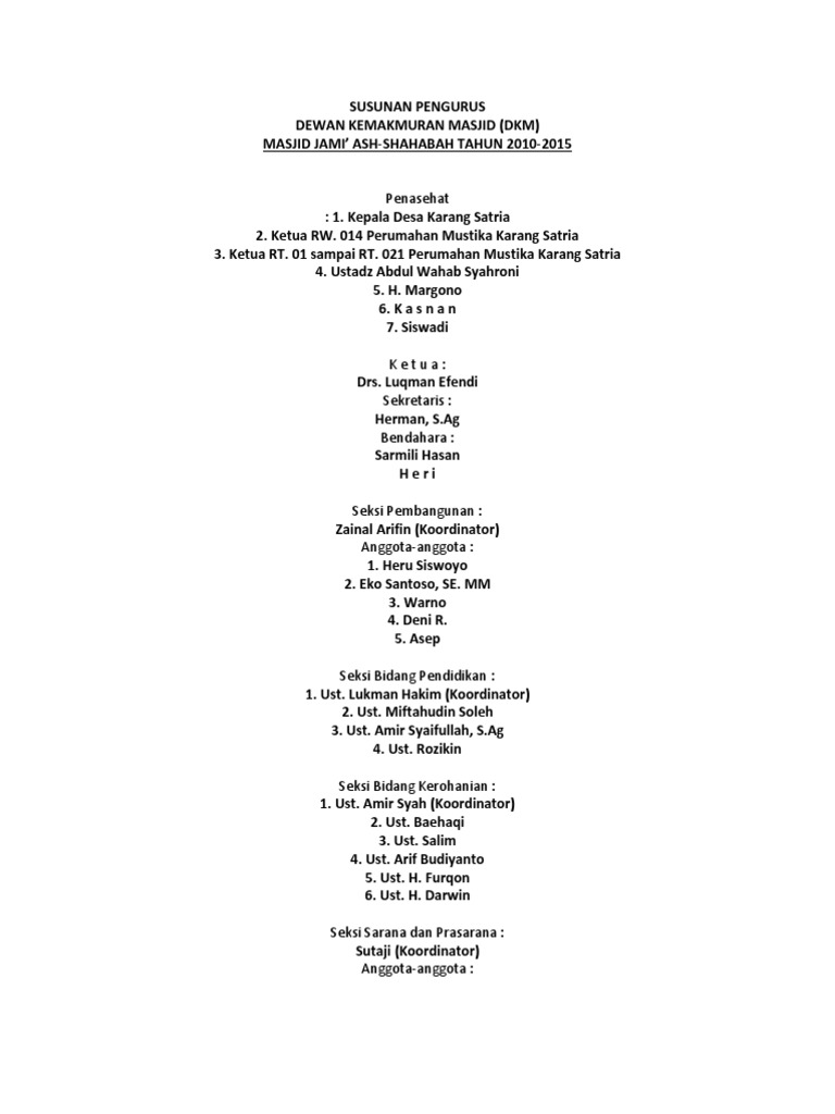 Perkembangan generasi muda islam kini dan masa yang akan datang. Bagaimana susunan pengurus masjid jami'? Susunan dewan pembina, pengawas dan pengurus yayasan masjid jami' darussalam periode 2011 s.d 2016 dewan pembina ust. Kepala desa pangarengan penasehat : Contoh susunan pengurus takmir masjid hubungi kami 0822 2001 3330.
